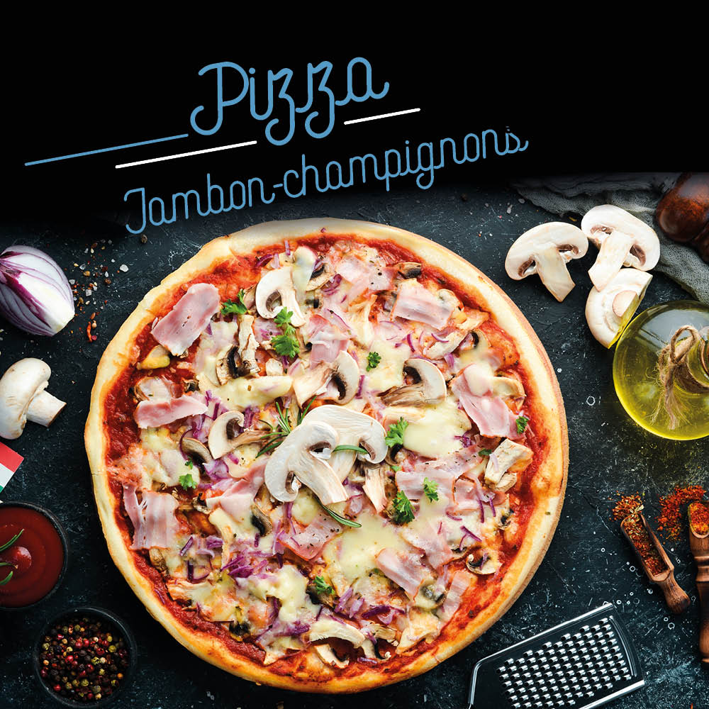 Pâte à pain, sauce tomate, jambon blanc, champignons émincés, olives noires.